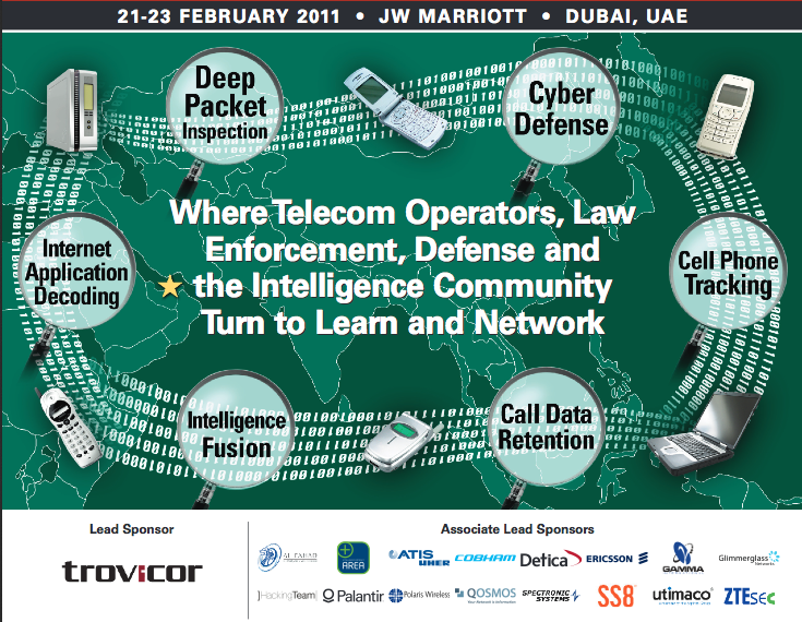 Il est en tout cas certain qu'au cours des années 2010-2011, Qosmos a été particulièrement active au Moyen et Proche-Orient, multipliant les démarchages via des conférences et des salons. Comme en témoigne cette plaquette datant du mois de février 2011, pour une conférence organisée à Dubai sur « les systèmes d'aide au renseignement pour l'interception légale, les investigations criminelles et la collecte d'informations ». Les plus grands noms de la surveillance du Net étaient présents : Trovicor, Utimaco, Al Fahad et bien sûr Qosmos, qui assure pas moins de cinq conférences, ateliers ou démonstrations.