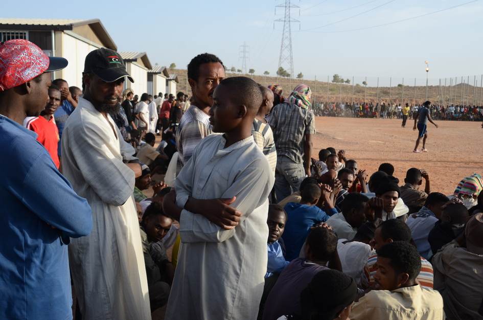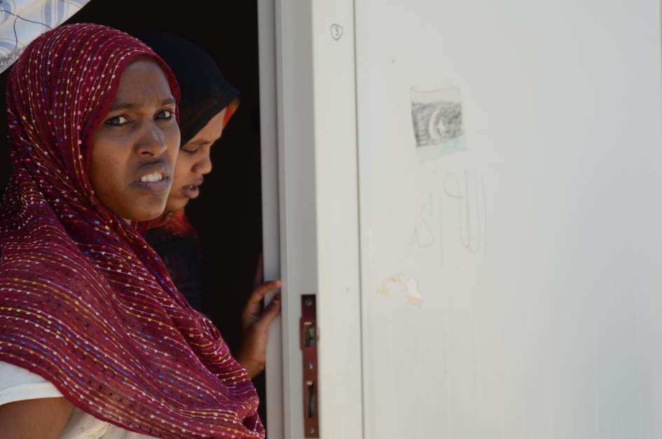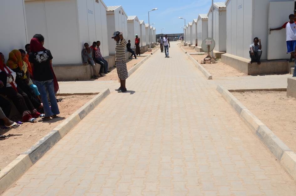 À Benghazi, dans le camp d'accueil du HCR, géré par le Croissant-Rouge libyen : construit dans un ancien « village de logement », ce camp d'une entreprise de construction étrangère accueille d'un côté les « réfugiés considérés plus vulnérables », principalement des ressortissants de la Corne de l'Afrique, de l'autre côté des Libyens de Tawargha.