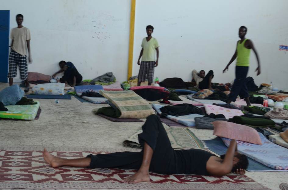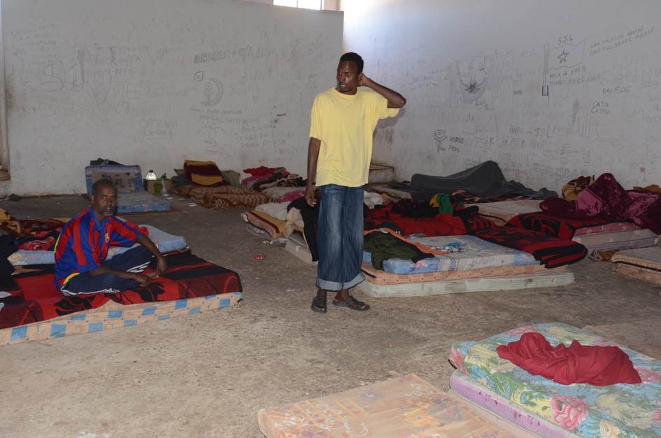 À Tripoli, le camp Toweisha se trouve sur la route qui mène du centre-ville à l'aéroport. Le jour de notre visite y étaient enfermés 508 migrants, dont 470 Somaliens. Certains avaient été arrêtés sur les lieux de travail, d'autres aux barrages à l'entrée de la ville, d'autres encore avaient été interceptés en haute mer et ramenés, voire refoulés en Libye. Les conditions de vie dans ce camp sont complètement insalubres : enfermés jour et nuit dans des chambres d'un hangar, sans fenêtres, la température ainsi que l'humidité atteignent des niveaux insupportables. Ils sont obligés de boire l'eau du robinet.