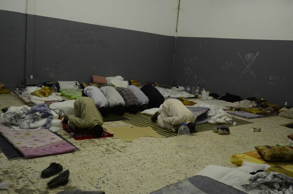 Au coucher du soleil, les migrants enfermés font la prière.