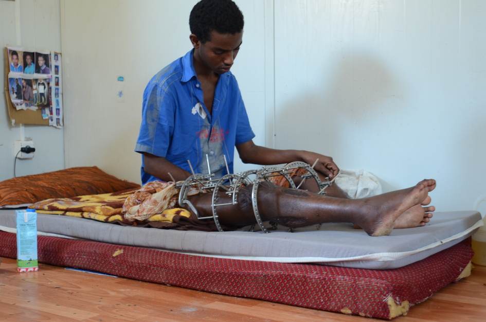 Ce jeune Somalien a été gravement blessé à une jambe car il s'est trouvé au milieu des affrontements qui ont éclaté à Koufra, une ville au sud du pays. Koufra est à la fois un lieu de fortes tensions entre tribus et milices et un des principaux carrefours des routes migratoires en provenance du Soudan et donc de la Corne de l'Afrique. Après avoir été opéré, ce jeune n'a pas vu de médecin pendant plus d'un mois. La dernière radiographie remonte à deux mois. Désespéré par sa condition, il veut partir, enlever l'instrument qui lui bloque la jambe, et prendre un bateau pour l'Italie.