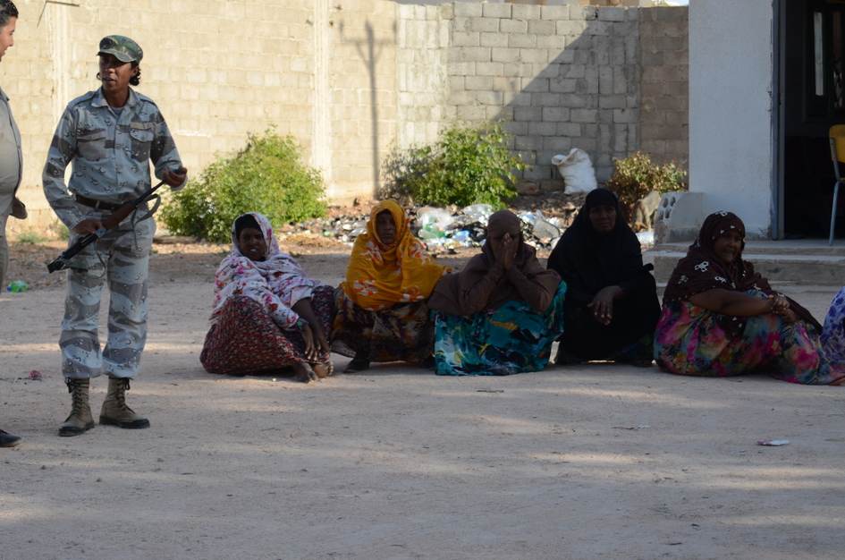 Comme dans tous les centres de rétention du pays, ce camp est sous le contrôle de milices locales. Les policiers « de garde » sont souvent armés de kalachnikov, qui ont un rôle d'intimidation envers les migrants. Cette photo a été prise au moment où un groupe de six femmes vient d'arriver.
